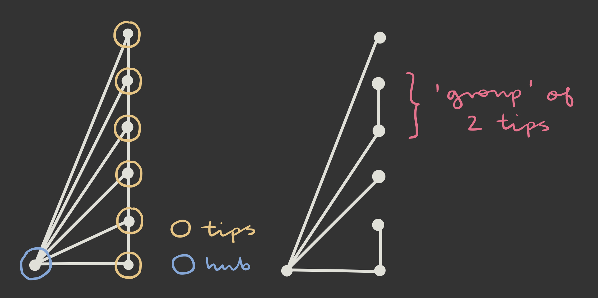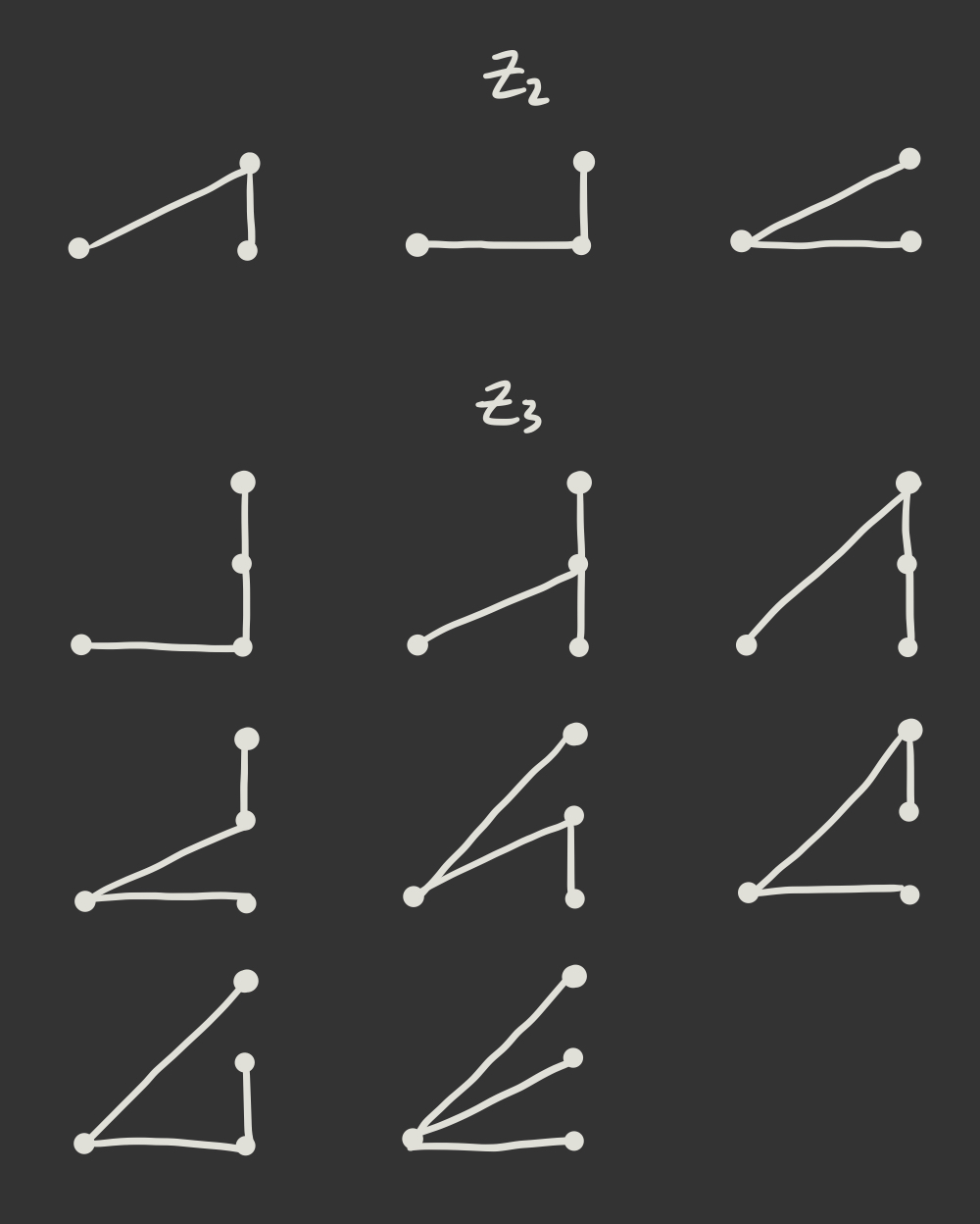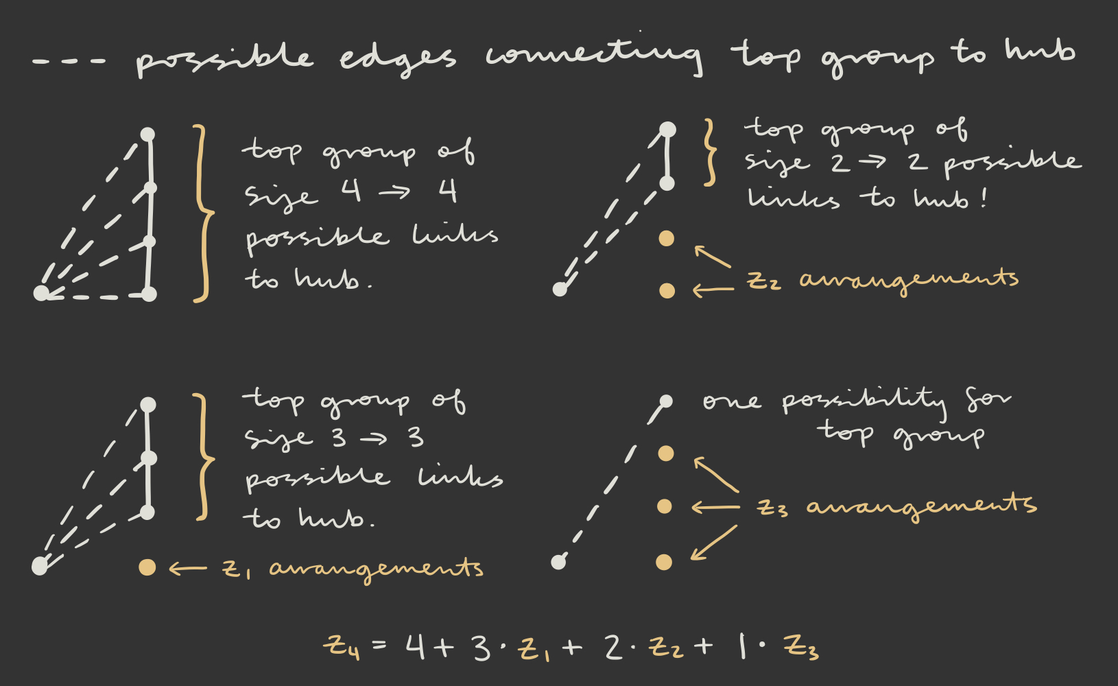 if the top group has 4 tips, then there are four ways that group can be linked to the hub, as represented by the dashed lines, and we are done with no more recursive cases to consider. if the top group has 3 tips, then there are three ways that group can be linked to the hub, and the last point can be connected to the hub \( z_1 \) number of ways. if the top group has 2 tips, then there are two ways that group can be linked to the hub, and the last two points can be connected to the hub \(z_2\) number of ways, and so on.