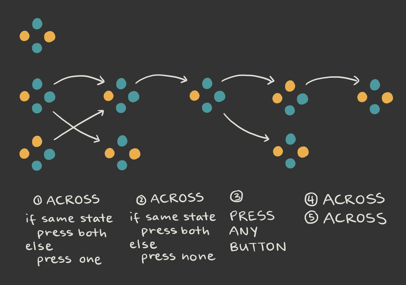 hint 2 points to the leftmost state above. if we knew our door was in that state, then we can always do an across move, press both buttons, and open the door. our objective is thus to put the door in the leftmost state above within a finite number of steps.
