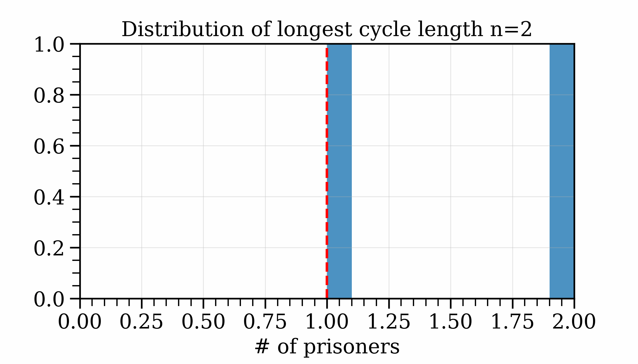 the start of the animation looks a little wonky, but as \( n \rightarrow \infty \), the distribution stabilizes. the red line here is plotted at \( \frac{n}{2} \), and represents the maximum longest cycle length that will guarantee a success for the prisoners. importantly we see that that probability mass left of the red line stabilizes past \( n = 100\), which means that probability of success does not decay below a threshold as \( n \rightarrow \infty\), which is also consistent with our asymptotic success rate plot above!